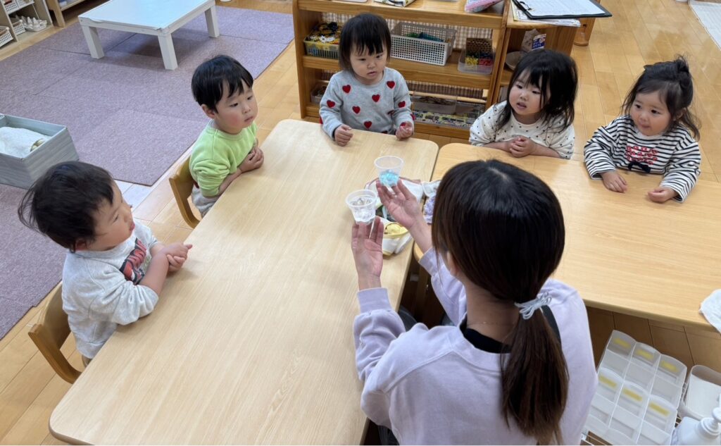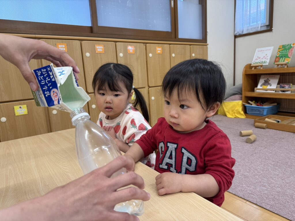 いつも戸外であそんでいる大好きなシャボン玉🫧「われてほしくなーい」「いっぱいしたーい!」との声から「じゃあ作ってみようか」とさっそくみんなで実験!👀