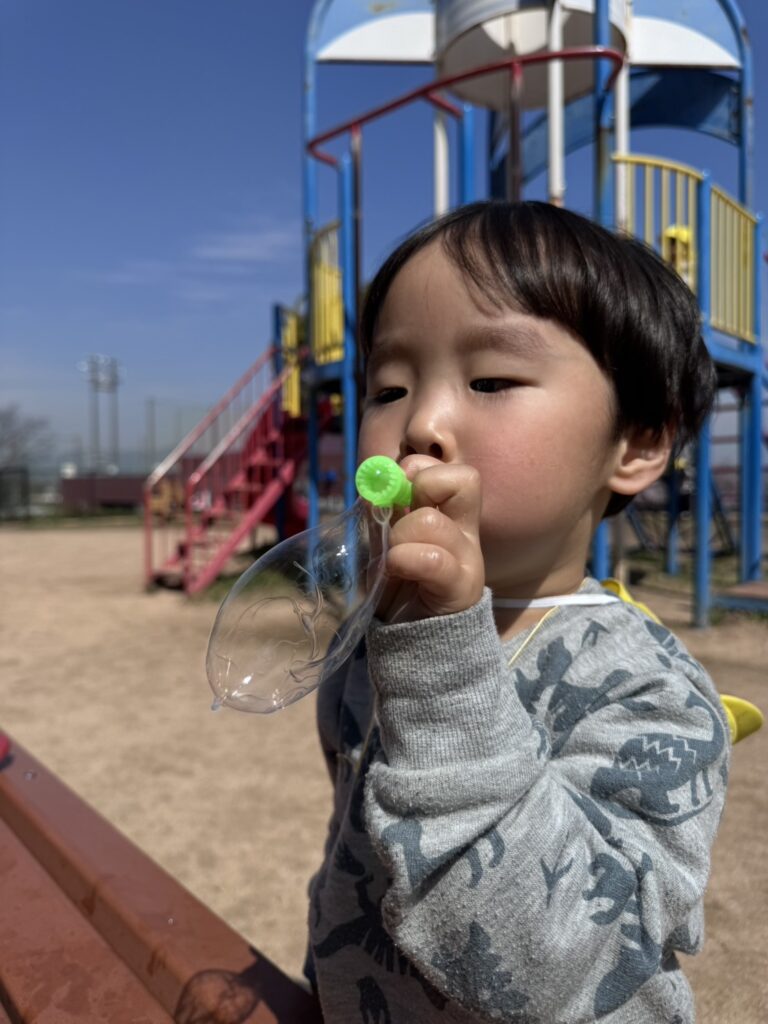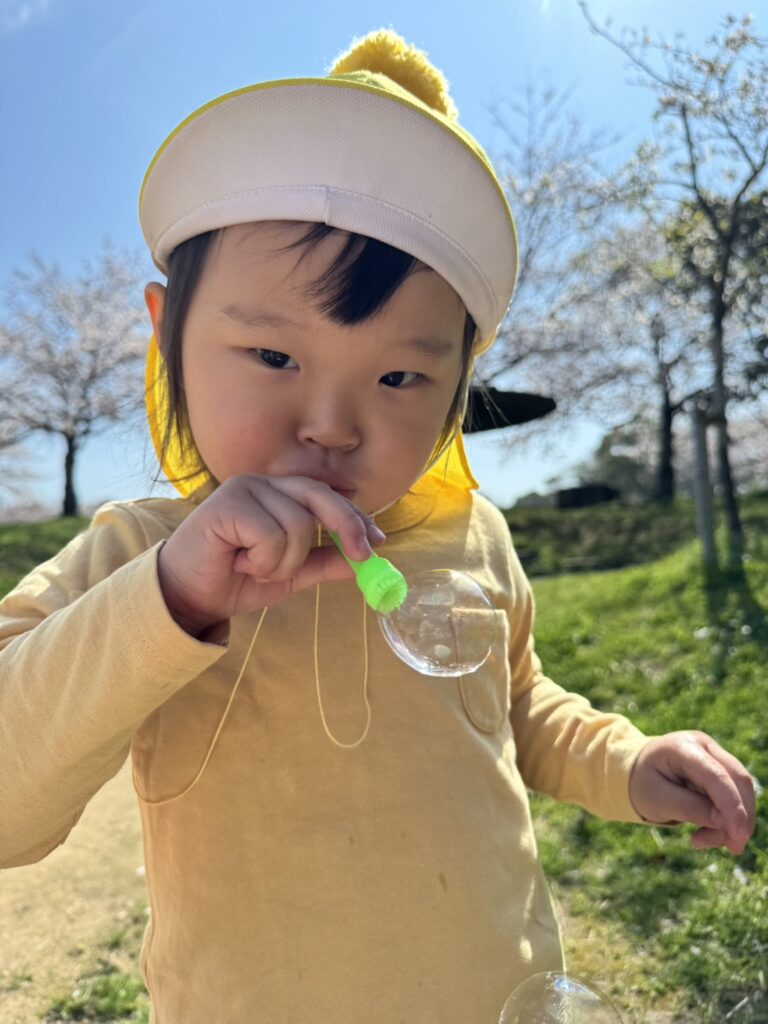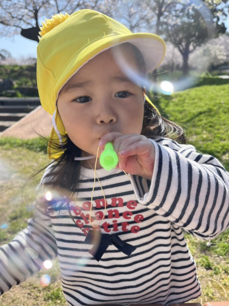 出来上がったシャボン玉液は戸外に行く際に必ず持っていきみんな嬉しそうに吹いています♪はじめは吹くのが難しかったようですが「ちょん ちょん ふー」のリズムで少しずつ上手に吹けるようになり大喜びの子どもたちです😊✨